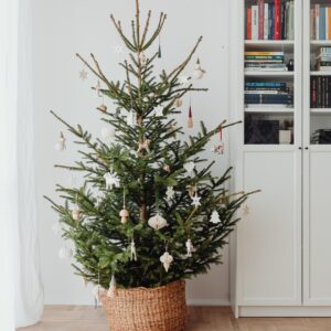 A small, well-lit tree placed where it won’t block pathways or furniture flow