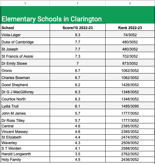 Below, you’ll find a comparison table of Clarington’s elementary schools, listed by Fraser Institute score, along with more detailed profiles and direct links to each school’s website—helping you make the best choice for your child’s education.